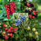 Leuchtend rote Beeren, die Vögel und Insekten anziehen.